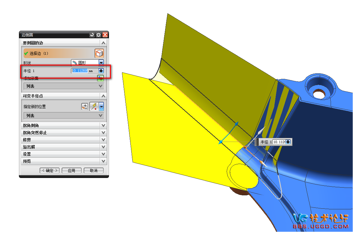 3.用“幾何屬性”命令測量兩個面之間的R角是多少,并且將R角的數(shù)據(jù)復制下來,然后用“邊倒圓”命令將R角倒上,粘貼R角的數(shù)據(jù)到半徑1對話框中,確定